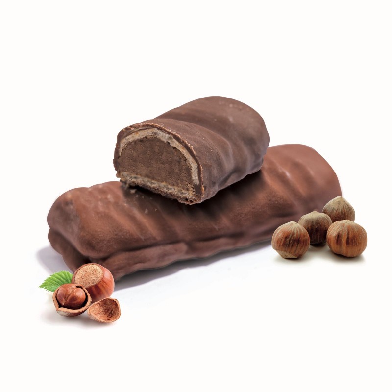 Lingotto ricoperto di cioccolato al Latte, preparato alimentare ad alto contenuto di fibre, a ridotto contenuto di zuccheri con edulcoranti, confezionato in 5 porzioni da 30g