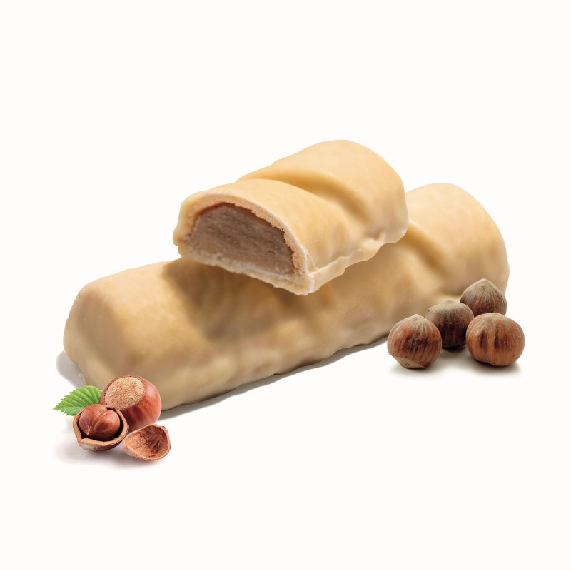 Lingotto ricoperto di cioccolato Bianco, preparato alimentare ad alto contenuto di fibre, a ridotto contenuto di zuccheri con edulcoranti, confezionato in 5 porzioni da 30g