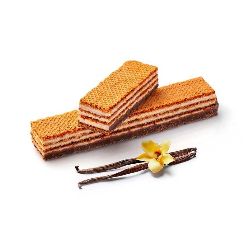 Wafer snack dolce al gusto di vaniglia, preparato alimentare ad alto contenuto di fibre, a ridotto contenuto di zuccheri con edulcoranti,confezionato in 5 porzioni da 42g